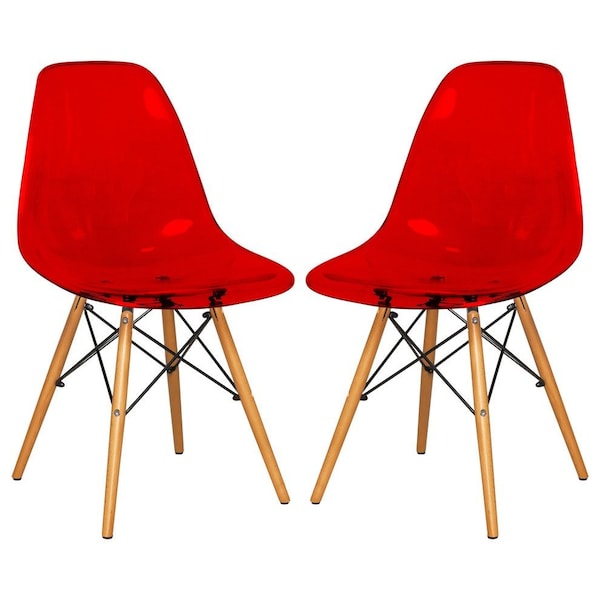Dover Plastic Dining Side Chair with Wooden Legs, Transparent Red, 2PK