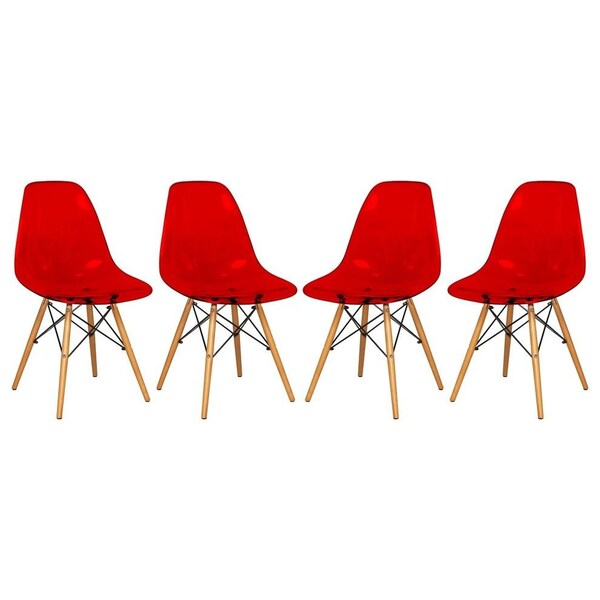 Dover Plastic Dining Side Chair with Wooden Legs, Transparent Red, 4PK
