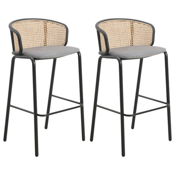 Ervilla Wicker Bar Stool with Fabric Seat and Black Powder Coated Steel Frame, Grey, 2PK