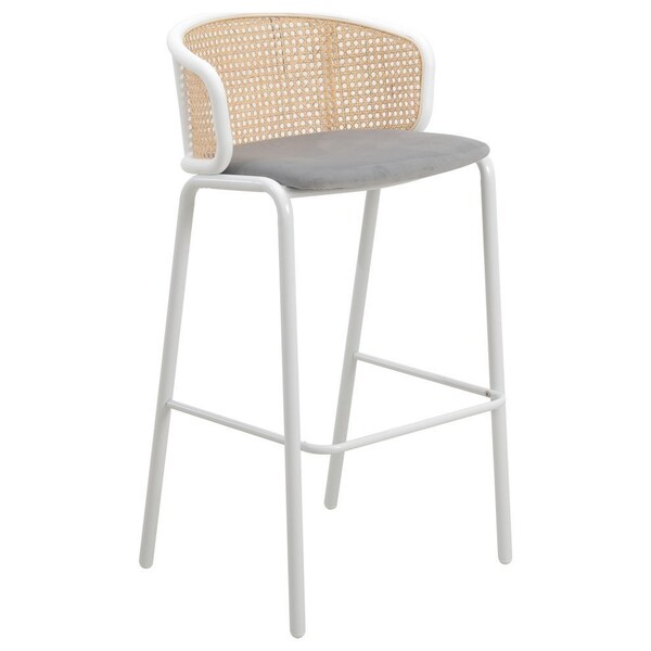 Ervilla Wicker Bar Stool with Fabric Seat and White Powder Coated Steel Frame, Grey