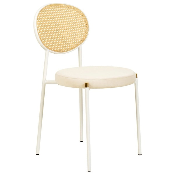 Introducing the Euston Dining Chair, where style, comfort, and durability come together seamlessly. This chair features a sleek white stainless steel frame and an intricately woven rattan backrest that provides a natural aesthetic and optimal breathability. The sturdy base supports up to 330 pounds, ensuring reliable everyday use, while the powder-coated finish resists scratches, rust, and wear, maintaining its sleek appearance over time. The round, plush seat is upholstered in luxurious velvet and filled with high-density sponge, offering superior comfort. Easy spot cleaning keeps it looking fresh with minimal effort. Plastic glides protect your floors and make repositioning easy. Assembly is quick and straightforward with clear instructions included. Enhance your space with the Euston Dining Chair- where elegance meets practicality.