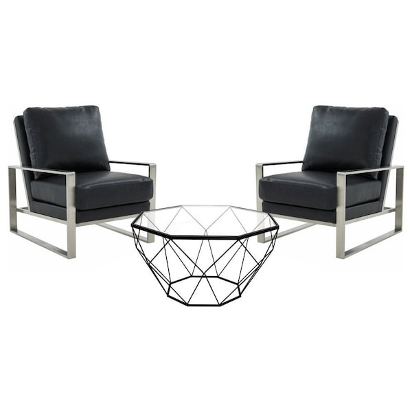 Jefferson Leather Armchair, Silver Frame & Large Octagon Coffee Table, Geometric Base, Black (Discontinued)