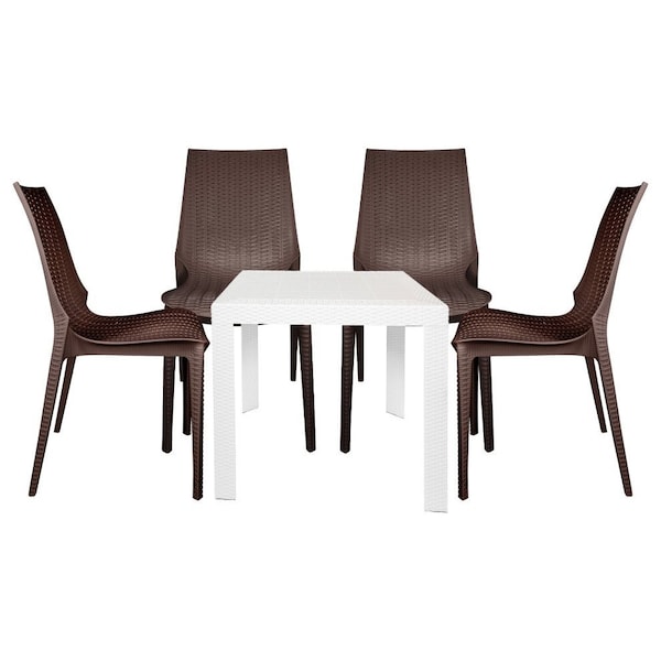 Kent 5-Piece Dining Set, Plastic Square Table & 4 Stackable Chairs with Weave Design, White/Brown