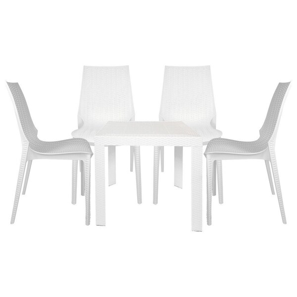 Introducing the Kent Outdoor Patio Dining Set - a perfect addition to any outdoor setting. This outdoor dining set is made from polypropylene material, designed to be durable and withstand the wear and tear of daily use. It is also water-resistant and UV-resistant, making them the perfect set for your outdoor space, no matter the weather condition. The table and chairs are also lightweight, which makes it easy to move around. It also comes with plastic cap floor protectors, which protect your floors from scratches and damage. The dining table has an umbrella hole so that you can use it with an umbrella and keep cool in the shade. It is a simple yet elegant table that is perfect for any outdoor setting. The chairs in this set are stackable, making them easy to store and save space when not in use. The Kent Outdoor Dining Set is perfect for those who love to entertain their friends and family on their porch, patio, or by the pool. with its attractive weave design, durable plastic material, and weather-resistant features, this set is sure to make your outdoor space more comfortable and stylish.