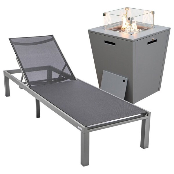 Introducing the Marlin Patio Chaise Lounge Chair and Square Fire Pit Table Set is the perfect addition to your outdoor living space. This modern and stylish set combines comfort, durability, and functionality, allowing you to create a welcoming outdoor oasis for relaxation and entertainment. The modern chaise lounge chair and square fire pit table set are crafted with lightweight yet sturdy aluminum material, this set ensures easy mobility and long-lasting performance. Aluminum is known for its strength, with a powder-coated finish this provides enhanced durability, protecting the furniture from rust and corrosion making it an ideal choice for outdoor furniture that can withstand regular use and changing weather conditions. The modern chaise lounge chair in this set features a comfortable and breathable mesh sling-back design and armrests offering a convenient place to rest your arms while lounging and keeping you cool and relaxed during hot summer days by the pool or in your backyard. It is also equipped with non-slip foot pads which will protect your patio, lawn, or backyard from scratches or damage. The modern square fire pit table in this set is designed with a tempered glass shield, this adds an elegant touch to the design while providing a protective barrier around the fire pit. Setting up your outdoor oasis is a breeze with this set. It requires simple assembly, and all necessary hardware and instructions are included. Within no time, you'll have your lounge chair and fire pit table ready for relaxation and entertainment.
