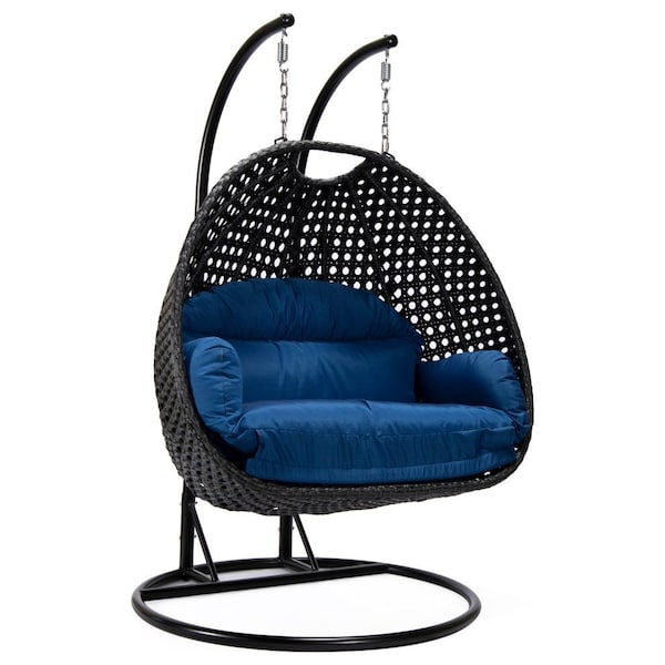 Mendoza Charcoal Wicker Hanging 2 person Egg Swing Chair with Blue Cushions