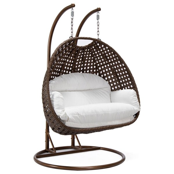 Mendoza Dark Brown Wicker Hanging 2 person Egg Swing Chair with Whie Cushions