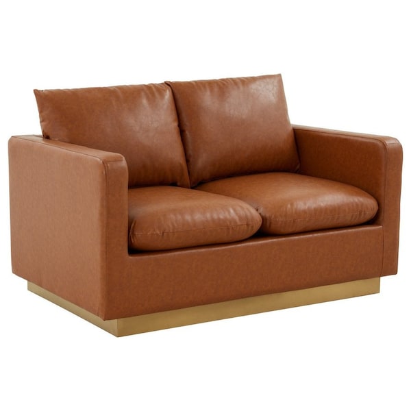 Nervo Upholstered Leather Loveseat with Gold Frame, Cognac Tan