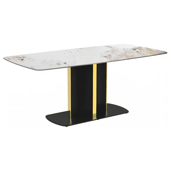 Elevate your dining space with the Sylva Modern Rectangular Dining Table, a stunning piece designed to enhance both form and function in your kitchen and dining room. The contemporary design of this dining table is evident in its spacious 55in rectangular tabletop, providing ample room for family gatherings, festive celebrations, and intimate meals alike. The tabletop is crafted from cutting-edge sintered stone or glass, materials highly prized for their durability and low-maintenance characteristics. Beyond functionality, these tabletops introduce a sense of opulence to your dining area, enhancing its visual appeal. Adding a touch of elegance to the table is the robust gold steel base with stylish legs. This base is not only about aesthetics but also about longevity. The steel base is further adorned with a powder-coated finish, serving a dual purpose by enhancing its aesthetic charm and providing protection against wear and corrosion. The pedestal base is a distinctive feature of this dining table, designed with a rectangular form that adds both stability and style to your dining experience. For your convenience, the assembly process for this dining table is made manageable with clear and comprehensive instructions provided. All the necessary hardware is included.