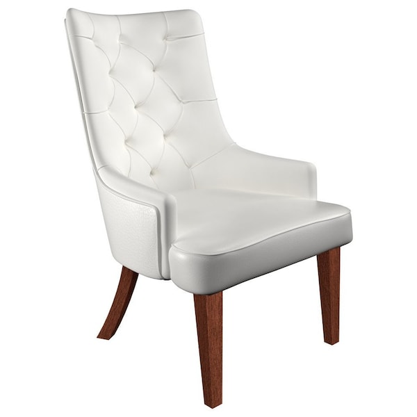 Elevate your dining experience with this elegant high-back Spruce Dining Chair, combining timeless design with modern comfort. Upholstered in luxurious tufted leather or velvet, this chair exudes sophistication and style. The high backrest offers excellent support, while the gently curved arms provide a comfortable seating experience. Constructed with durable rubberwood legs stained in a rich walnut color, this chair ensures lasting stability and elegance. The seat is filled with soft sponge padding for superior comfort, making it ideal for long dinners and gatherings. Designed for versatility, this chair fits seamlessly into both dining and living spaces, adding a touch of luxury to any room. Its pristine white leather finish is easy to maintain, making it perfect for everyday use.