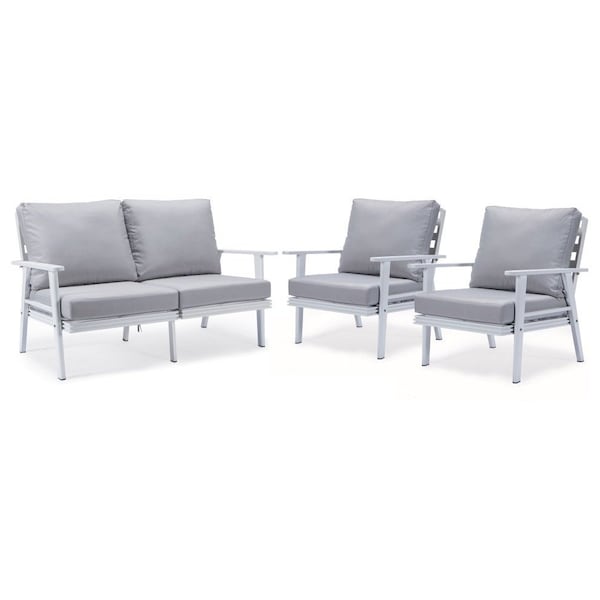 Walbrooke 3-Piece Outdoor Patio Set, White Aluminum Frame & Removable Cushions, Light Grey
