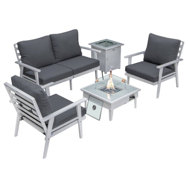 Enjoy cocktails with a friend in your backyard with this inviting Patio conversation set. The Wallbroke collection is the perfect option to relax under the sun or gaze at the stars while enjoying the amazing outdoors. The Set Includes a Loveseat, 2 Armchairs, a Fire Pit Table, and a Tank Holder. The Fire Pit Table will keep you warm during chilly weather. The cushions are stuffed with super-soft, Cotton fill for a custom seating experience. This decorative set is weather-resistant and boasts beautiful powder-coated Aluminum for long-lasting use. The 5-piece Conversation set fits up to 4 adults comfortably and adds the perfect experience to any outdoor space and is a durable choice that can stay in good shape for years. It has a modern style, which brings a timeless feel to your patio.