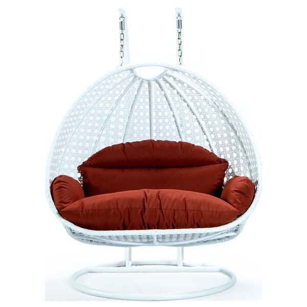 White Wicker Hanging 2 person Egg Swing Chair with Dark Orange Cushions