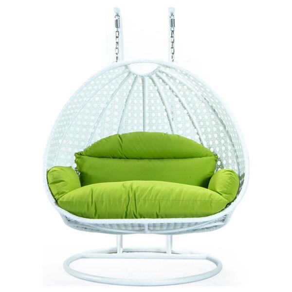 White Wicker Hanging 2 person Egg Swing Chair with Light Green Cushions