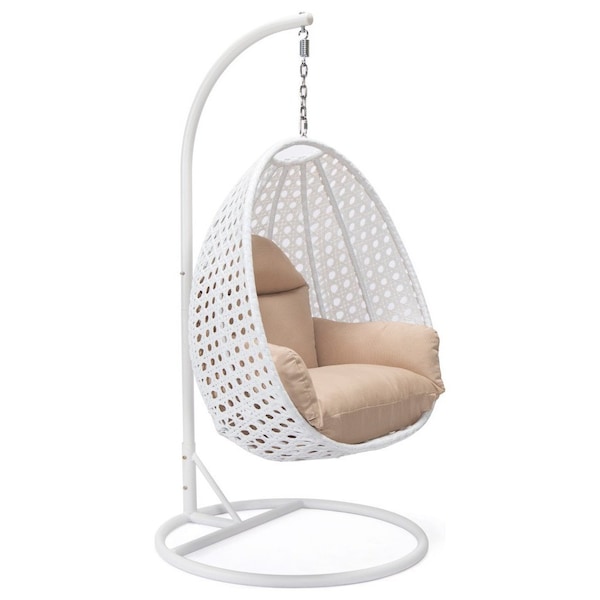 White Wicker Hanging Egg Swing Chair with Beige Cushions