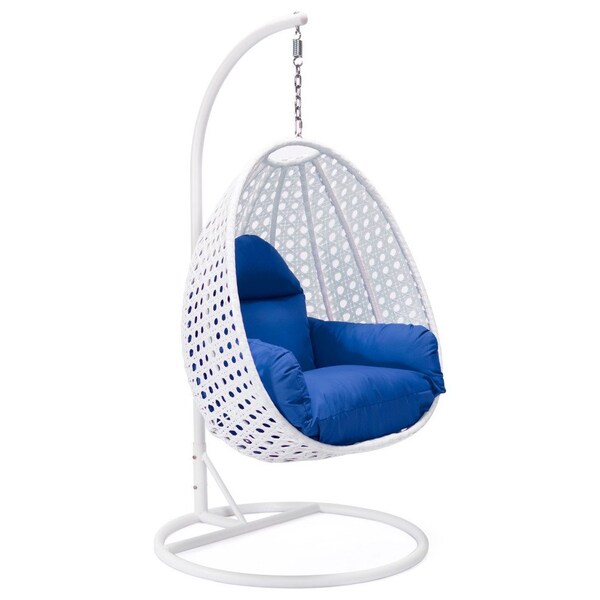 White Wicker Hanging Egg Swing Chair with Blue Cushions