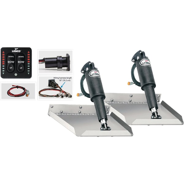 Fast response electric actuators for precise control. Fully submersible. All plug & play Deutsch connections. Blades are 304 stainless steel with 1" turned up edges and an 85° inside taper. Edge mount tabs are space savers. The actuators mount at the trailing edge of the blades, requiring less transom height than the standard mount tabs. Min transom height: 11". 2" Hinge height.Kit Includes:12-volt actuators (2) with 6' leads and Deutsch connectors; 20' actuator extension harnesses (2) with Deutsch connectors; Stainless Steel trim tab blades, 12 gauge (2); Stainless Steel mounting hardware; LED Indicator Switch Kit