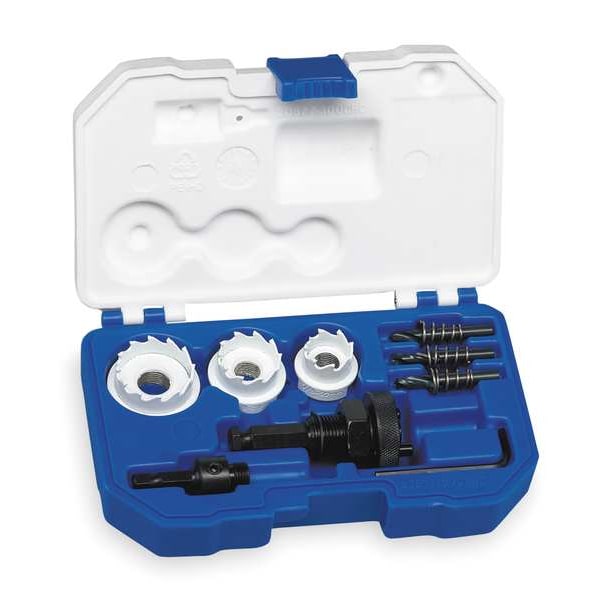 General Purpose Hole Saw Kit, Arbor Design Built-In Arbor, Tooth Material Carbide Tipped, Teeth per Inch 3, Max. Cutting Depth 3/8 in, Impact Rated Not Impact Rated, Thread Size 1/2 In.-20, 5/8 In.-18, Shank Size 3/8 in, 1/2 in, Pilot Drill Size 1/4 in dia, Number of Pieces 12