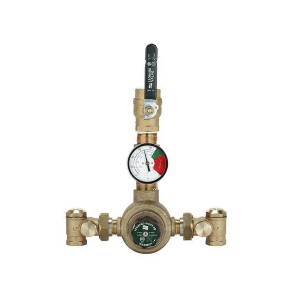 Thermostatic Mixing Valve, Body Material Bronze, Flow Rate 1 to 58 gpm, Inlet Type NPT, Outlet Type NPT, Inlet Size 1 in, Outlet Size 1 1/4 in, Temp. Range 95 Degrees to 135 Degrees F, Max. Pressure 125 psi, Overall Height 6 in, Overall Width 6 in, Inlet Temperature (Cold) 40 Degrees to 85 Degrees F, Inlet Temperature (Hot) 120 Degrees to 200 Degrees F, For Use With Domestic Hot Water Applications, Includes Check-stops with Strainer, Standards ASSE 1017, Compliance Lead Free