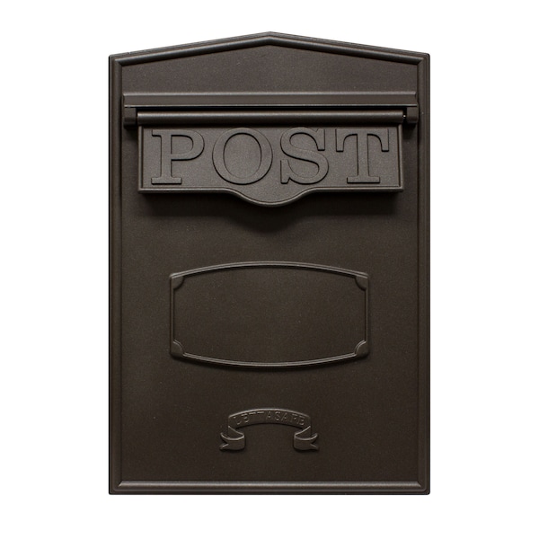 Bloomsbury rear retrieval mailbox (Bronze color) . Mounted through a masonry wall or fence, mail is delivered through the front flap and retrieved from the rear lockable secure access door. Mailbox is made from solid aluminum, is totally waterproof and has a quality black enamel finish. It features a large capacity secure mail storage area with lockable rear retrieval door which is supplied with 2 keys. Rear access door opening: W 7 in. x H 7.5 in. Incoming opening: W 9 in. x H 2.5 in. Weight: 15 lbs.