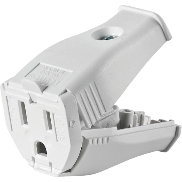 Leviton straight blade grounded thermoplastic plug. Features clamp tight hinged design which provides fast and easy assembly. Ideal for replacement of connectors on tools appliances and extension cords. Resists moisture and chemicals. Dimpled body provides a secure hinge grip. Built-in cord grip adjusts automatically. 2-pole.