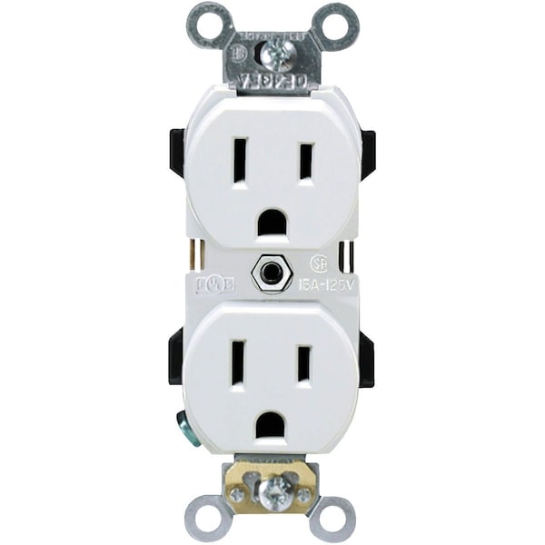 Industrial Specification Grade duplex outlet featuring a nylon face and base. Back and side wired 4 large-head brass spring loaded terminal screws with steel wire connectors and 8 back wiring holes for maximum wiring convenience. Wire containment rib groundamatic self-grounding strap locked into base green grounding screw. Meets all requirements of latest Fed Spec. WC-596F. 15 amps/125 volts NEMA (National Electrical Manufacturers Association) 5-15R. UL (Underwriters Laboratories) listed.
