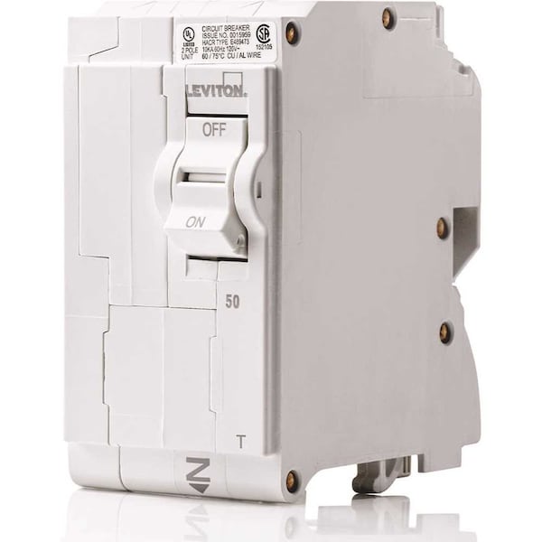 Leviton Circuit Breakers provide overload and short-circuit protection and feature an all plug-on design. All hot and neutral wires terminate at custom lugs in the panel, not at the circuit breaker, so the entire panel can be wired without circuit breakers installed. Branch circuit breakers can be easily plugged on at final installation. They also feature color indicators in the handle to easily see operational status at-a-glance. For applications up to 60 Amp when using copper wire or 50 Amp when using aluminum wire.Simple - features an all plug-on design - no wiring to the circuit breakerIntuitive - color indicators in the handle to easily see operational status at-a-glanceApproachable - contemporary aesthetic and rocker style handle are more user friendly10 kA short-circuit ratingCompatible only with Leviton load centers