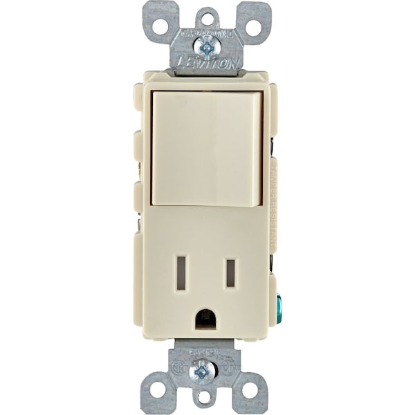 Leviton Decora commercial grade nylon single pole switch and tamper-resistant grounding receptacle combination. Shutter mechanism inside the receptacle blocks access to the contacts unless a 2-prong plug is inserted ensuring items such as hairpins and keys will be locked out. Features a narrow body back and side wired large head terminal screws that accept up to No. 10 copper wire. Triple wire power contacts for maximum conductivity and plug retention. Captive mounting screws for fast installation. Convenient washer-type break-off plaster ears for best flush alignment. Break-off tabs for easy 2-circuit conversion. Heavy-gauge rust-resistant steel mounting strap. NEMA 5-15R.