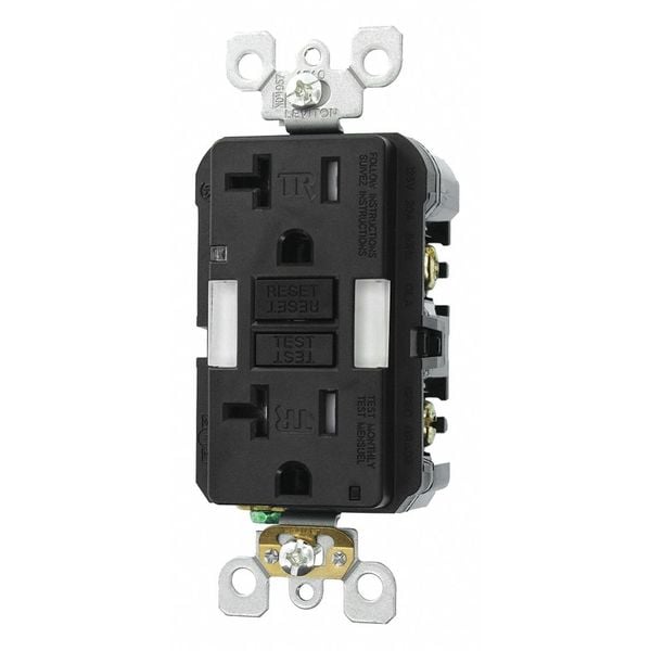 GFI Receptacle, Connection Orientation Straight, Cover Type No Cover, Current Rating 20 A, GFCI Yes, Grounding Grounded, Hazardous Location Specification Not Applicable, Housing Color Black, Housing Material Polycarbonate, Mount Type Flush, NEMA Enclosure Rating Not Rated, NEMA Receptacle Configuration 5-20R, Number of Poles 2, Number of Wires 3, Phase Single, Polarized Yes, Receptacle Type Decorator Duplex, Resistance Properties Tamper Resistant