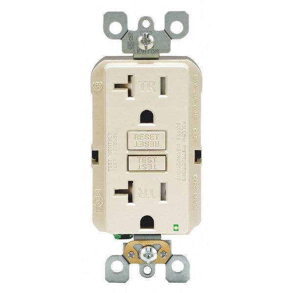 GFI Receptacle, Connection Orientation Straight, Cover Type No Cover, Current Rating 20 A, GFCI Yes, Grounding Grounded, Housing Color Light Almond, Housing Material Polycarbonate, Mount Type Flush, NEMA Enclosure Rating Not Rated, NEMA Receptacle Configuration 5-20R, Number of Poles 2, Number of Wires 3, Phase Single, Polarized No, Receptacle Type Decorator Duplex, Resistance Properties Tamper Resistant