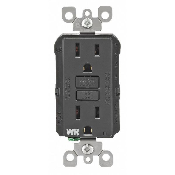 GFI Receptacle, Connection Orientation Straight, Cover Type No Cover, Current Rating 15 A, GFCI Yes, Grounding Grounded, Housing Color Black, Housing Material Polycarbonate, Mount Type Flush, NEMA Enclosure Rating Not Rated, NEMA Receptacle Configuration 5-15R, Number of Poles 2, Number of Wires 3, Phase Single, Polarized No, Receptacle Type Decorator Duplex, Resistance Properties Impact Resistant, Weather Resistant