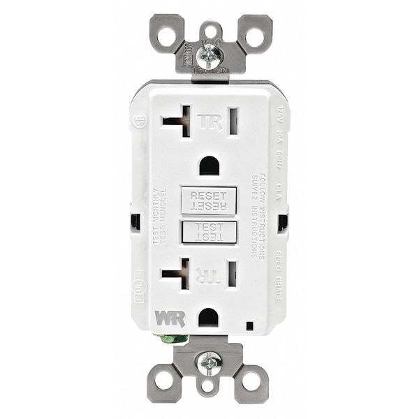 GFI Receptacle, Connection Orientation Straight, Cover Type No Cover, Current Rating 20 A, GFCI Yes, Grounding Grounded, Housing Color White, Housing Material Polycarbonate, Mount Type Flush, NEMA Enclosure Rating Not Rated, NEMA Receptacle Configuration 5-20R, Number of Poles 2, Number of Wires 3, Phase Single, Polarized No, Receptacle Type Decorator Duplex, Resistance Properties Impact Resistant, Tamper Resistant, Weather Resistant