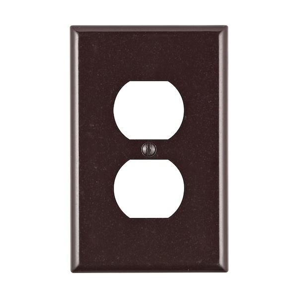Leviton 1 Gang 1 Duplex Receptacle wall plate in brown color features a thermoset plastic construction for optimum dielectric strength and arc resistance. Wall plate is resistant to fading, oil, grease and organic solvents. Wall plate is scratch resistant for use with larger volume outlet boxes and can be easily cleaned. Wall plate features a smooth finish for an elegant look. Wall plate is used to conceal irregularities in the surrounding wall.