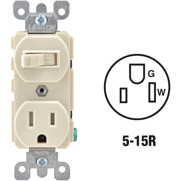 Leviton commercial grade tamper resistant thermoplastic switch/outlet combination. Features a shutter mechanism inside the receptacle that blocks access to the contacts unless a 2-prong plug is inserted ensuring that items such as hairpins and keys will be locked out. Side wired accepts up to No. 12 copper wire. Steel strap. Receptacle: NEMA 5-15R. Switch: single pole.