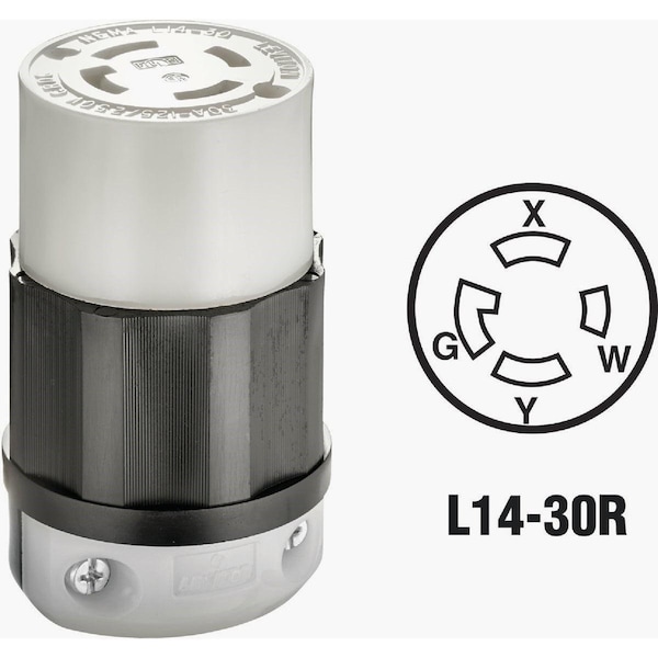 Locking Connector, L14-30R, 30 A, 125/250V AC, Single Phase, 3 Pole, Screw Terminals, Black, White