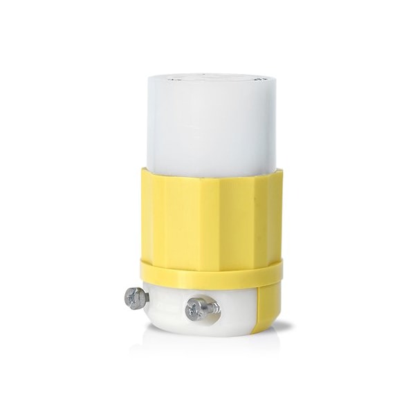Locking Connector, Connection Orientation Straight, Current Rating 15 A, Housing Color White, Yellow, Housing Material Nylon, IP Rating Not Rated, NEMA Receptacle Configuration L5-15R, Number of Poles 2, Number of Wires 3, Phase Single, Polarized Yes, Resistance Properties Chemical Resistant, Impact Resistant, UV/Sunlight Resistant, Shrouded No, Voltage Rating 125V AC, Wire Connection Type Screw Terminals, Wiring Style Standard, Cap Type No Cap or Cover, Contact Material Brass