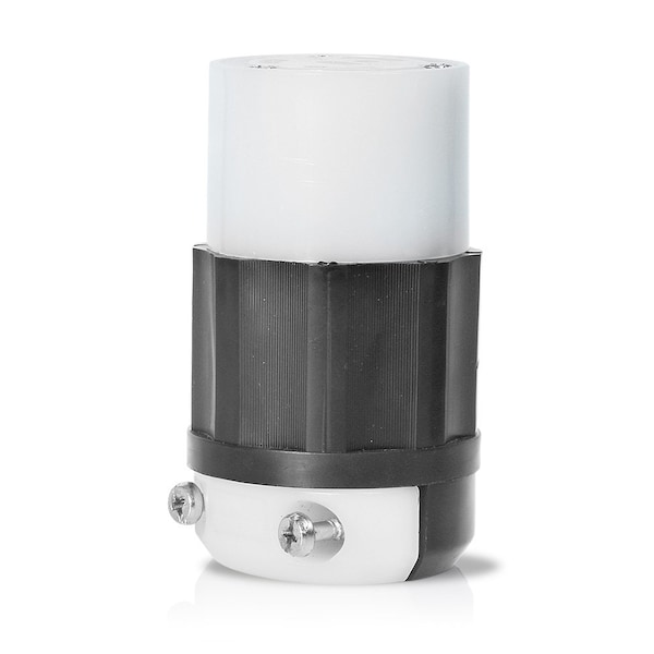 Locking Connector, Connection Orientation Straight, Current Rating 20 A, Housing Color Black, White, Housing Material Nylon, IP Rating Not Rated, NEMA Receptacle Configuration L5-20R, Number of Poles 2, Number of Wires 3, Phase Single, Polarized Yes, Resistance Properties Chemical Resistant, Impact Resistant, UV/Sunlight Resistant, Shrouded No, Voltage Rating 125V AC, Wire Connection Type Screw Terminals, Wiring Style Standard, Cap Type No Cap or Cover, Contact Material Brass
