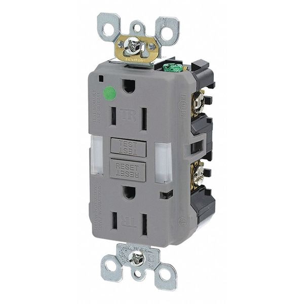 GFI Receptacle, Connection Orientation Straight, Cover Type No Cover, Current Rating 15 A, GFCI Yes, Grounding Grounded, Hazardous Location Specification Not Applicable, Housing Color Gray, Housing Material Thermoplastic, Mount Type Flush, NEMA Enclosure Rating Not Rated, NEMA Receptacle Configuration 5-15R, Number of Poles 2, Number of Wires 3, Phase Single, Polarized Yes, Receptacle Type Decorator Duplex, Resistance Properties Tamper Resistant