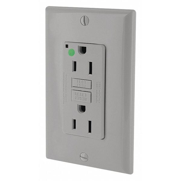 GFI Receptacle, Connection Orientation Straight, Cover Type No Cover, Current Rating 15 A, GFCI Yes, Grounding Grounded, Hazardous Location Specification Not Applicable, Housing Color Gray, Housing Material Polycarbonate, Mount Type Flush, NEMA Enclosure Rating Not Rated, NEMA Receptacle Configuration 5-15R, Number of Poles 2, Number of Wires 3, Phase Single, Polarized Yes, Receptacle Type Decorator Duplex, Resistance Properties Not Applicable
