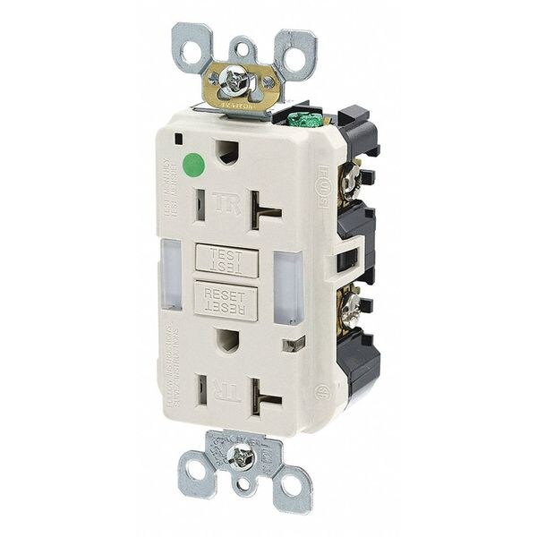 GFI Receptacle, Connection Orientation Straight, Cover Type No Cover, Current Rating 20 A, GFCI Yes, Grounding Grounded, Hazardous Location Specification Not Applicable, Housing Color Light Almond, Housing Material Polycarbonate, Mount Type Flush, NEMA Enclosure Rating Not Rated, NEMA Receptacle Configuration 5-20R, Number of Poles 2, Number of Wires 3, Phase Single, Polarized Yes, Receptacle Type Decorator Duplex, Resistance Properties Tamper Resistant