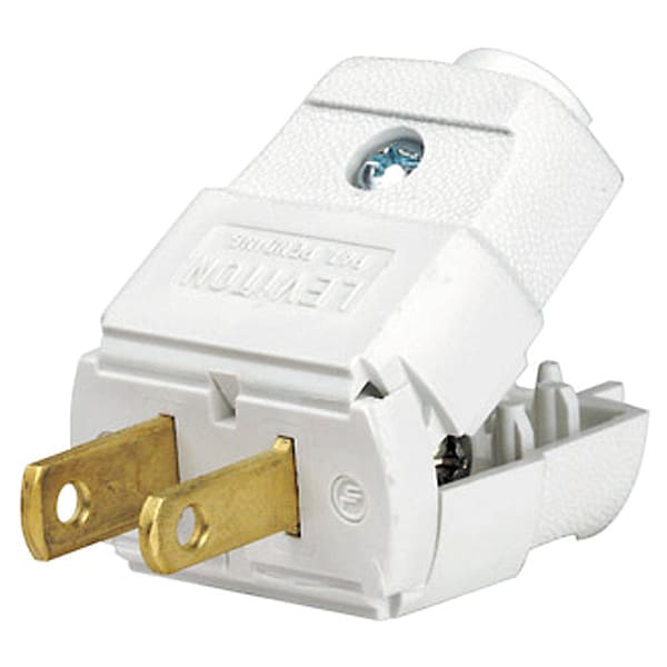 Straight Blade Plug, Connection Orientation Straight, Current Rating 15 A, Grounding Non-Grounded, Horsepower Rating 1/2 hp, Housing Color White, IP Rating Not Rated, NEMA Plug Configuration 1-15P, Number of Blades 2, Number of Poles 2, Phase Single, Polarized Yes, Voltage Rating 125V AC, Wire Connection Type Screw Terminals, Wiring Style Hinged, For Maximum Cable Diameter 0.25 in, Grade General Use, Housing Material Thermoplastic, Market Residential, Maximum Wire Size 16 AWG