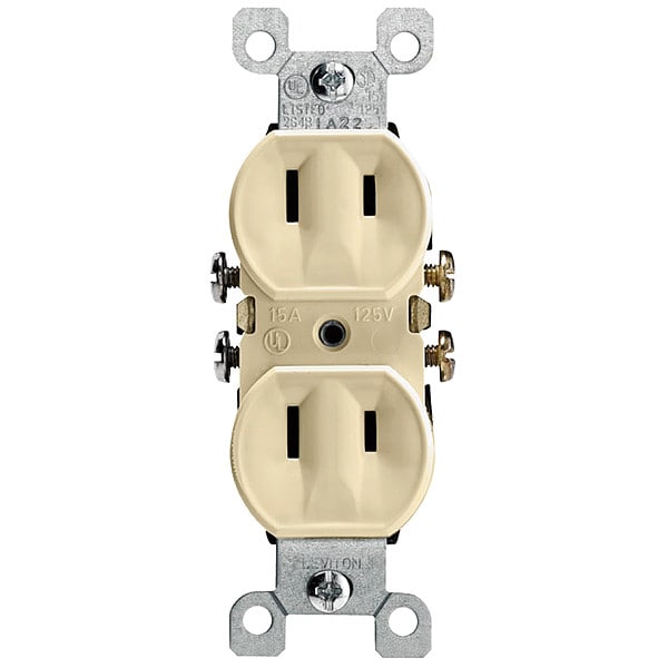 Receptacle, Connection Orientation Straight, Cover Type No Cover, Current Rating 15 A, GFCI No, Grounding Non-Grounded, Hazardous Location Specification Not Applicable, Housing Color Ivory, Housing Material Thermoplastic, Mount Type Surface, NEMA Enclosure Rating Not Rated, NEMA Receptacle Configuration 1-15R, Number of Poles 2, Number of Wires 2, Phase Single, Polarized No, Receptacle Type Duplex, Resistance Properties Not Applicable, Standards UL Listed, Voltage Rating 125V AC