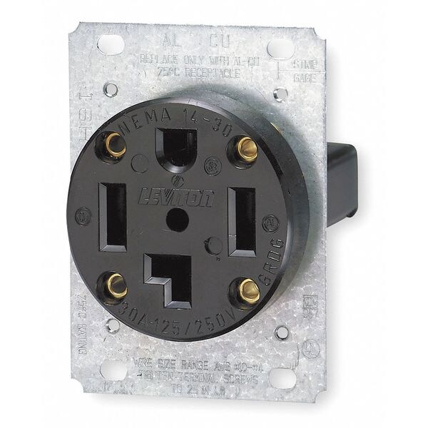Receptacle, Connection Orientation Straight, Cover Type No Cover, Current Rating 30 A, GFCI No, Grounding Grounded, Hazardous Location Specification Not Applicable, Housing Color Black, Housing Material Thermoplastic, Mount Type Flush, NEMA Enclosure Rating Not Rated, NEMA Receptacle Configuration 14-30R, Number of Gangs 1, Number of Poles 3, Number of Wires 4, Phase Single, Polarized Yes, Receptacle Type Single, Resistance Properties Not Applicable