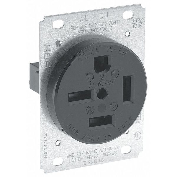 Receptacle, Connection Orientation Straight, Cover Type No Cover, Current Rating 50 A, GFCI No, Grounding Grounded, Hazardous Location Specification Not Applicable, Housing Color Black, Housing Material Nylon, Mount Type Recessed, NEMA Enclosure Rating Not Rated, NEMA Receptacle Configuration 15-50R, Number of Gangs 1, Number of Poles 3, Number of Wires 4, Phase Three, Polarized Yes, Receptacle Type Single, Resistance Properties Tamper Resistant