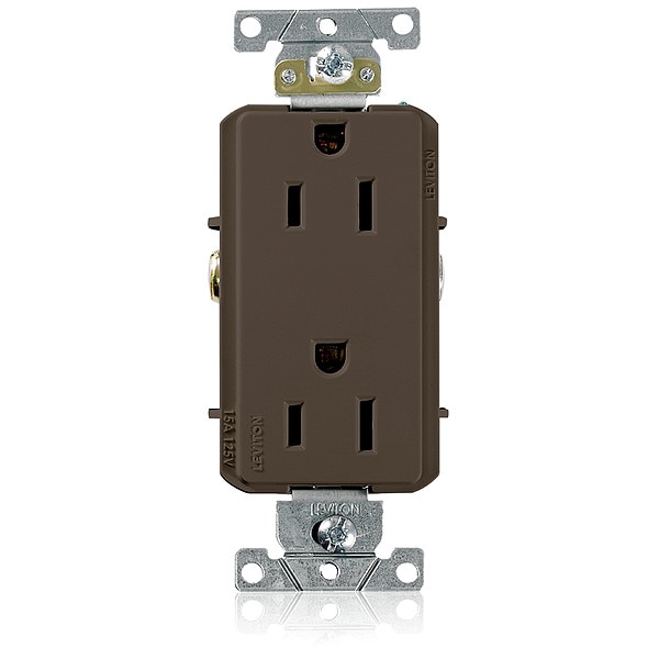 Receptacle, Connection Orientation Straight, Cover Type No Cover, Current Rating 15 A, GFCI No, Grounding Grounded, Hazardous Location Specification Not Applicable, Housing Color Brown, Housing Material PBT Polyester, Mount Type Flush, NEMA Enclosure Rating Not Rated, NEMA Receptacle Configuration 5-15R, Number of Poles 2, Number of Wires 3, Phase Single, Polarized Yes, Receptacle Type Decorator Duplex, Resistance Properties Not Applicable