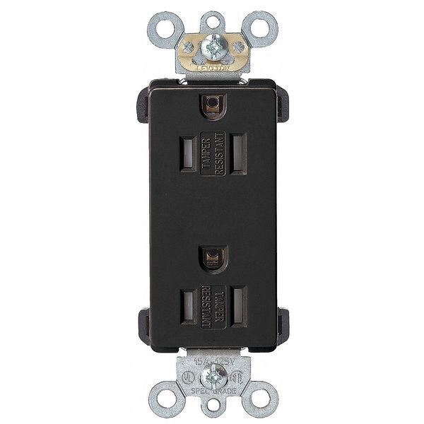 Receptacle, Connection Orientation Straight, Cover Type No Cover, Current Rating 15 A, GFCI No, Grounding Grounded, Hazardous Location Specification Not Applicable, Housing Color Black, Housing Material PBT Polyester, Mount Type Flush, NEMA Enclosure Rating Not Rated, NEMA Receptacle Configuration 5-15R, Number of Poles 2, Number of Wires 3, Phase Single, Polarized Yes, Receptacle Type Decorator Duplex, Resistance Properties Tamper Resistant
