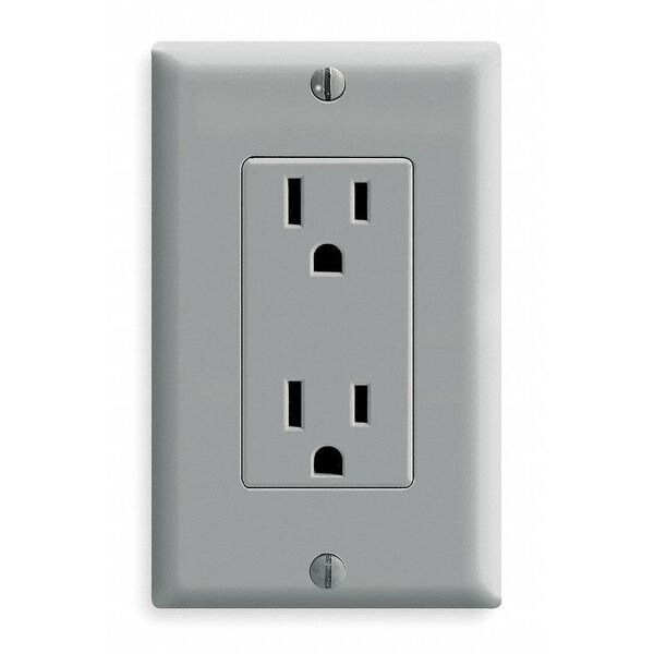 Receptacle, Connection Orientation Straight, Cover Type No Cover, Current Rating 15 A, GFCI No, Grounding Grounded, Hazardous Location Specification Not Applicable, Housing Color Gray, Housing Material Thermoplastic, Mount Type Flush, NEMA Enclosure Rating Not Rated, NEMA Receptacle Configuration 5-15R, Number of Gangs 1, Number of Poles 2, Number of Wires 3, Phase Single, Polarized Yes, Receptacle Type Decorator Duplex, Resistance Properties Impact Resistant