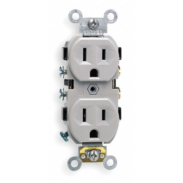 Receptacle, Connection Orientation Straight, Cover Type No Cover, Current Rating 15 A, GFCI No, Grounding Grounded, Hazardous Location Specification Not Applicable, Housing Color Gray, Housing Material Nylon, Mount Type Flush, NEMA Enclosure Rating Not Rated, NEMA Receptacle Configuration 5-15R, Number of Gangs 1, Number of Poles 2, Number of Wires 3, Phase Single, Polarized Yes, Receptacle Type Duplex, Resistance Properties Not Applicable