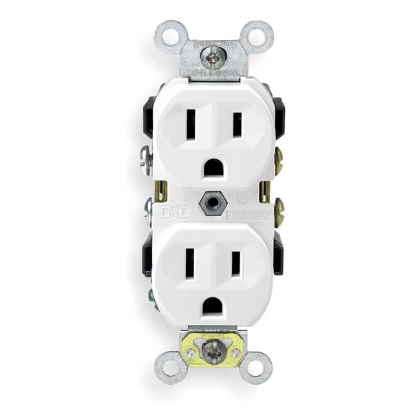 Receptacle, Connection Orientation Straight, Cover Type No Cover, Current Rating 15 A, GFCI No, Grounding Grounded, Hazardous Location Specification Not Applicable, Housing Color White, Housing Material Thermoplastic, Mount Type Flush, NEMA Enclosure Rating Not Rated, NEMA Receptacle Configuration 5-15R, Number of Poles 2, Number of Wires 3, Phase Single, Polarized No, Receptacle Type Duplex, Standards Class 6233-01, CSA C22.2 No. 42 File E152105, UL 498 File E13399, Voltage Rating 125V AC