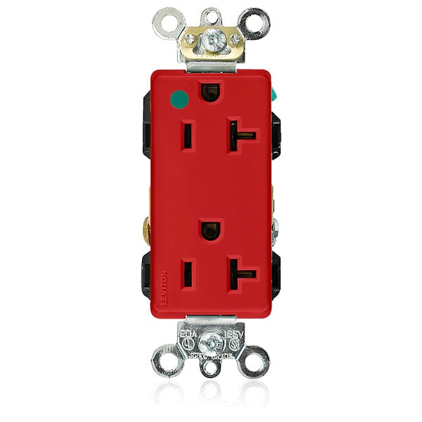 Receptacle, Connection Orientation Straight, Cover Type No Cover, Current Rating 20 A, GFCI No, Grounding Grounded, Hazardous Location Specification Not Applicable, Housing Color Red, Housing Material Nylon, Mount Type Flush, NEMA Enclosure Rating Not Rated, NEMA Receptacle Configuration 5-20R, Number of Poles 2, Number of Wires 3, Phase Single, Polarized Yes, Receptacle Type Decorator Duplex, Resistance Properties Impact Resistant